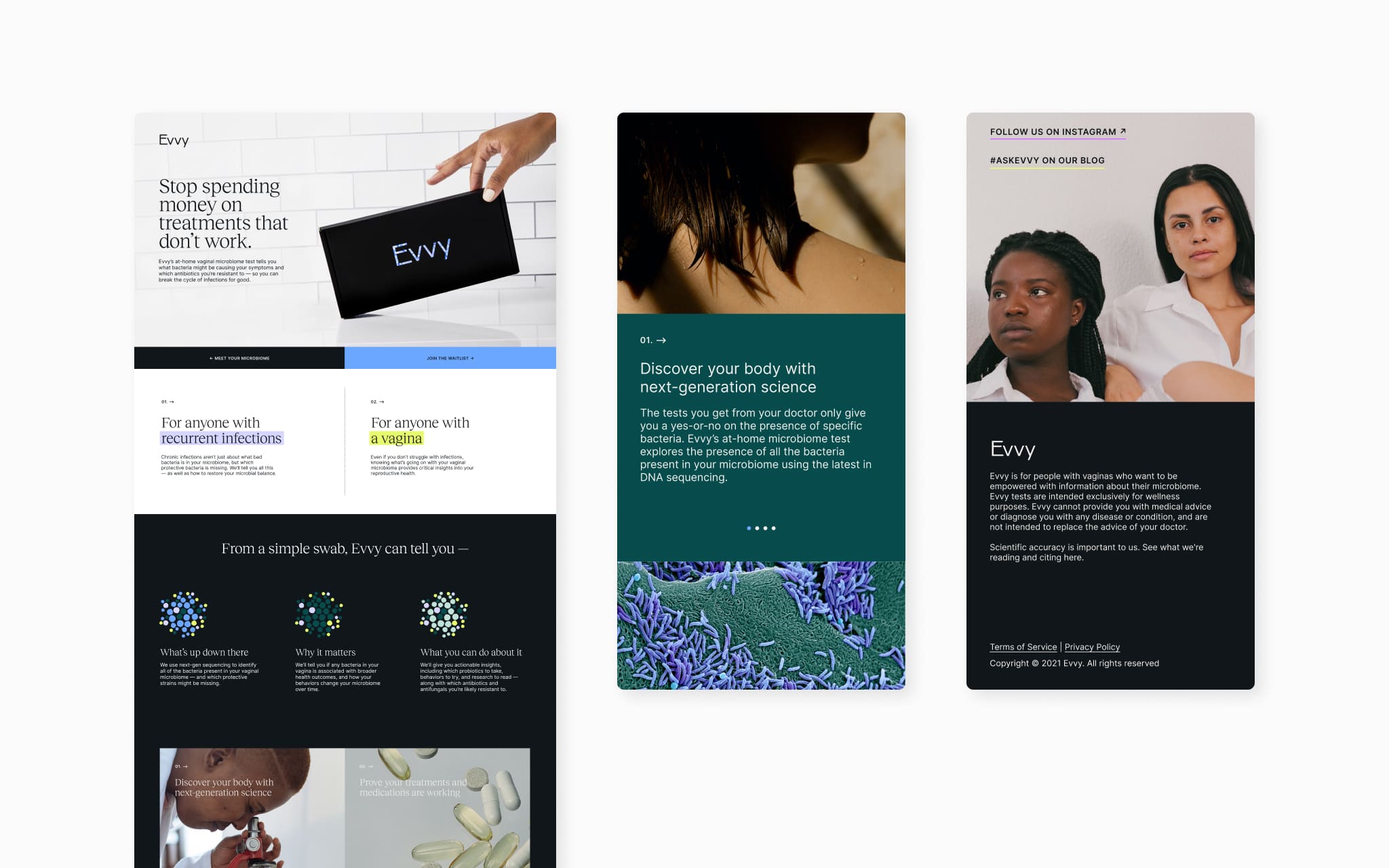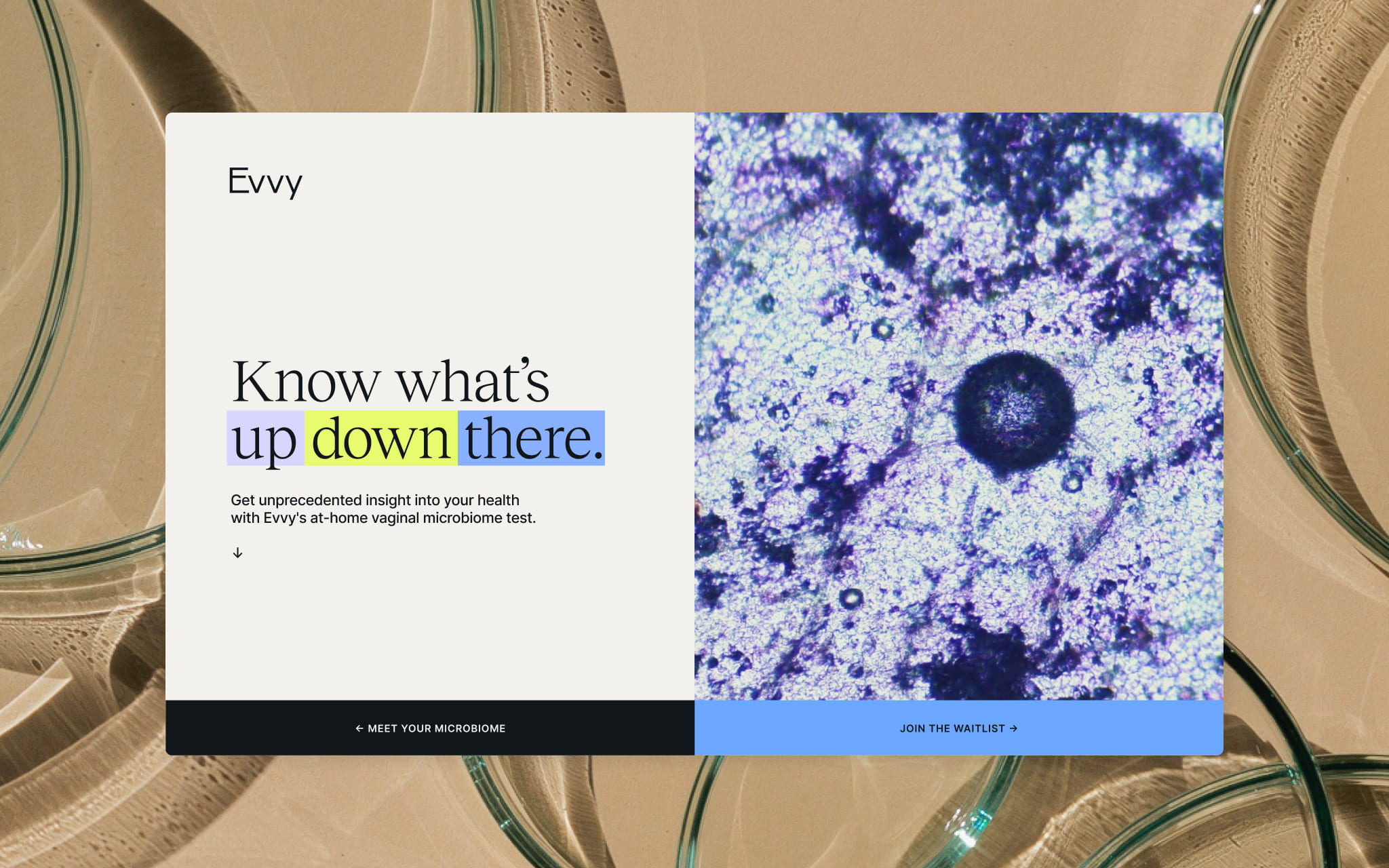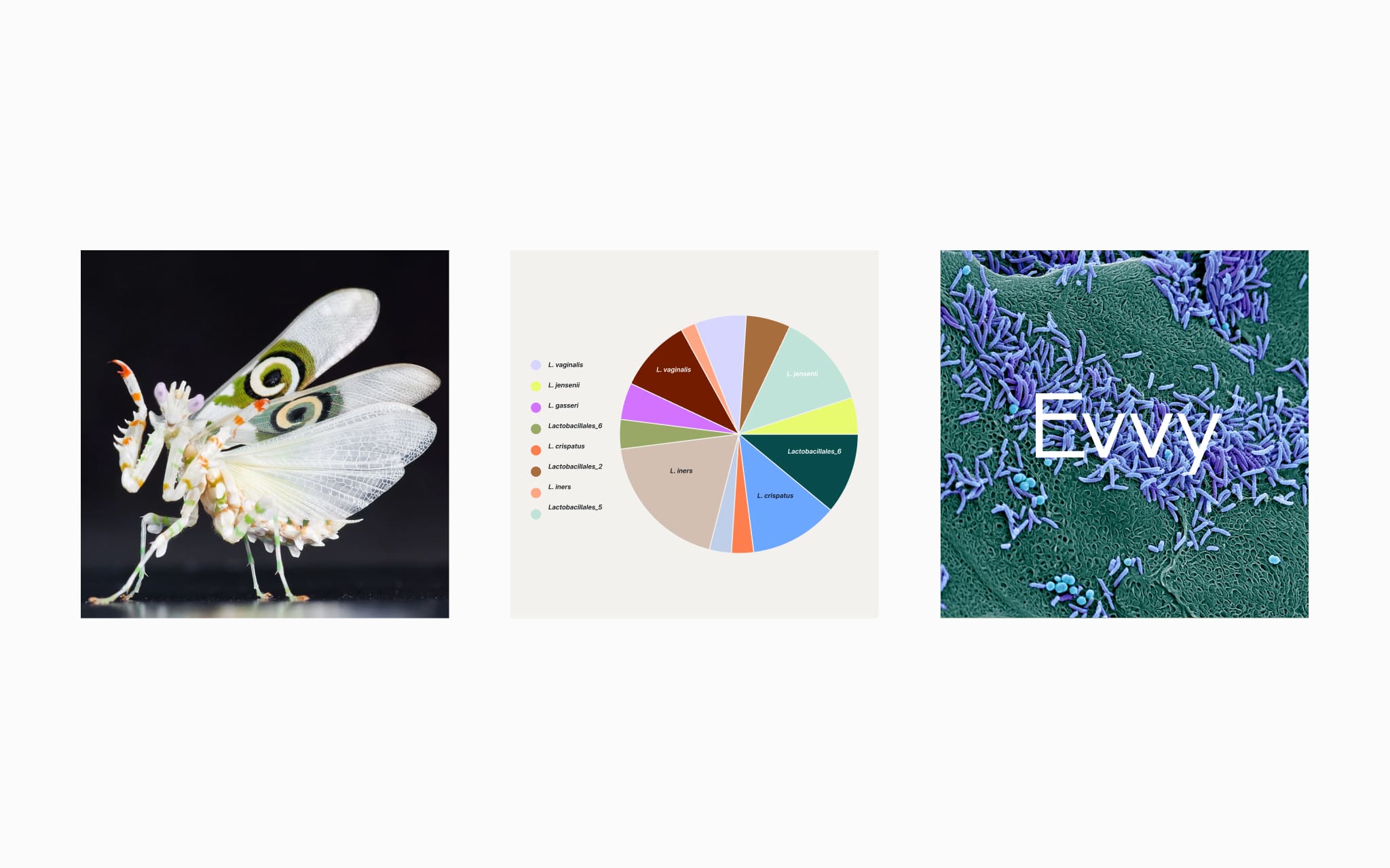 A thoughtful and refreshing identity for Evvy; a team whose mission is to close the gender health gap by discovering and leveraging overlooked biomarkers in the female body—starting with the vaginal microbiome.