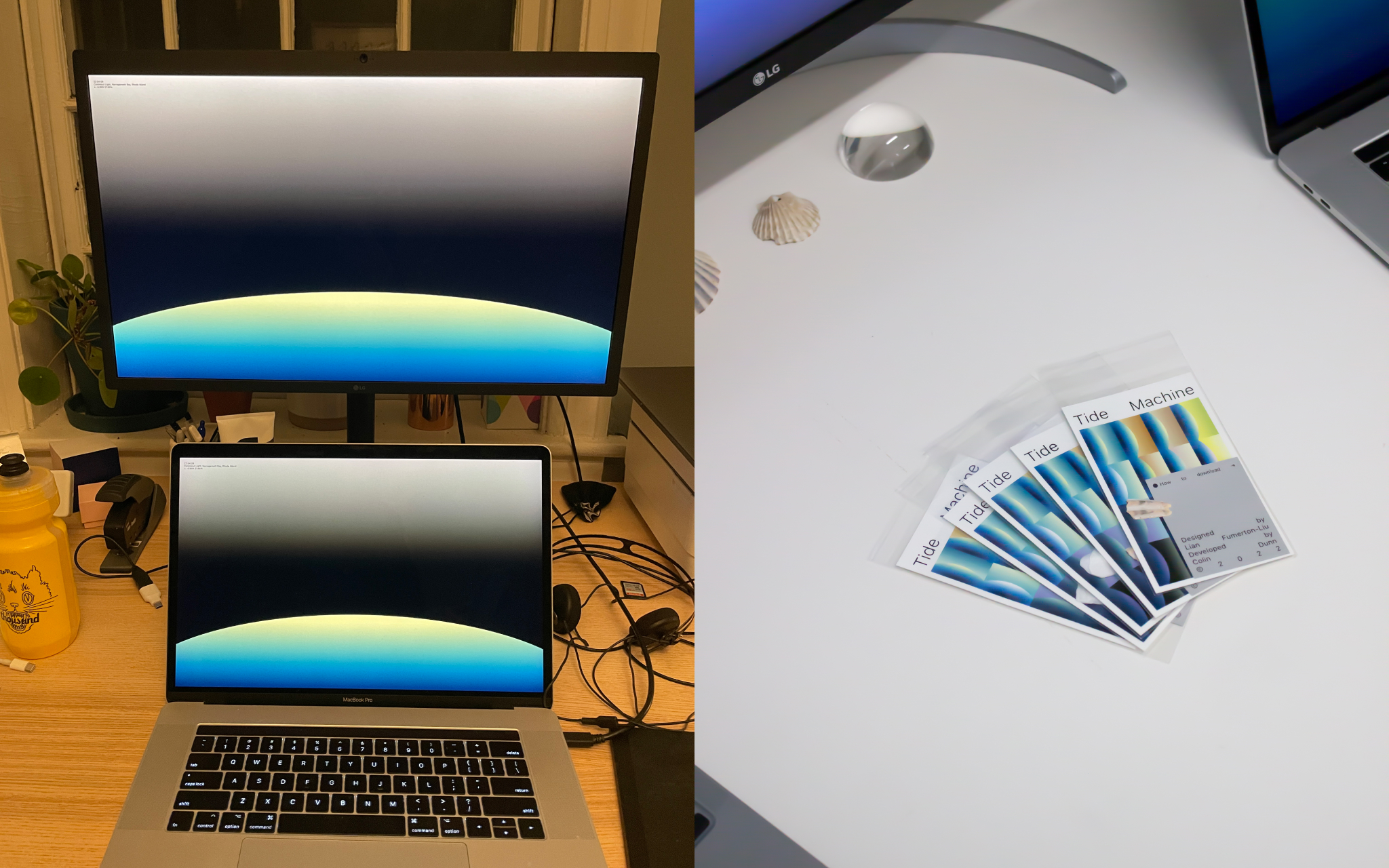 Pulling data from ocean tide stations across the world¹, Tide Machine is a screen saver that displays the rise and fall of real-time water levels at a given location. As our computers rest, light and color shift along with time and season.