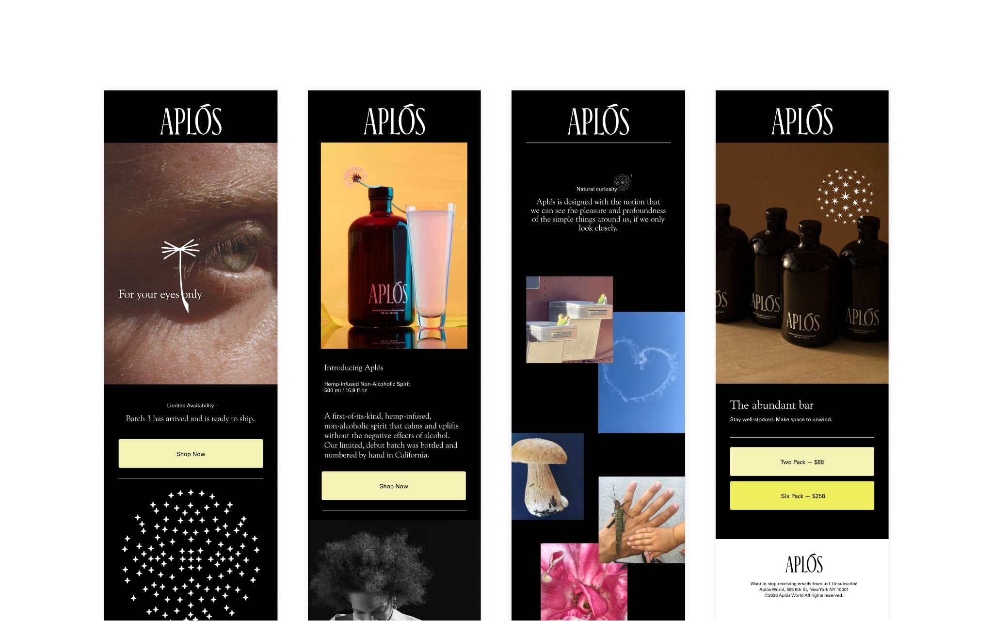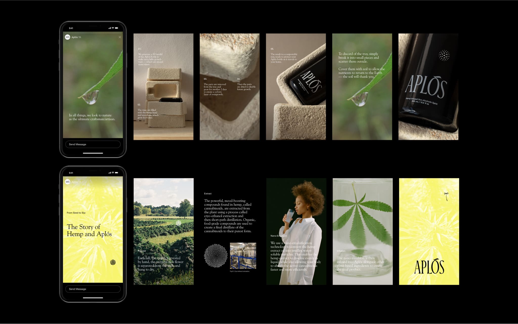 Templates and brand expansion for Aplós, a non-alcoholic hemp spirit designed for those moments in life that should be sipped slowly.
